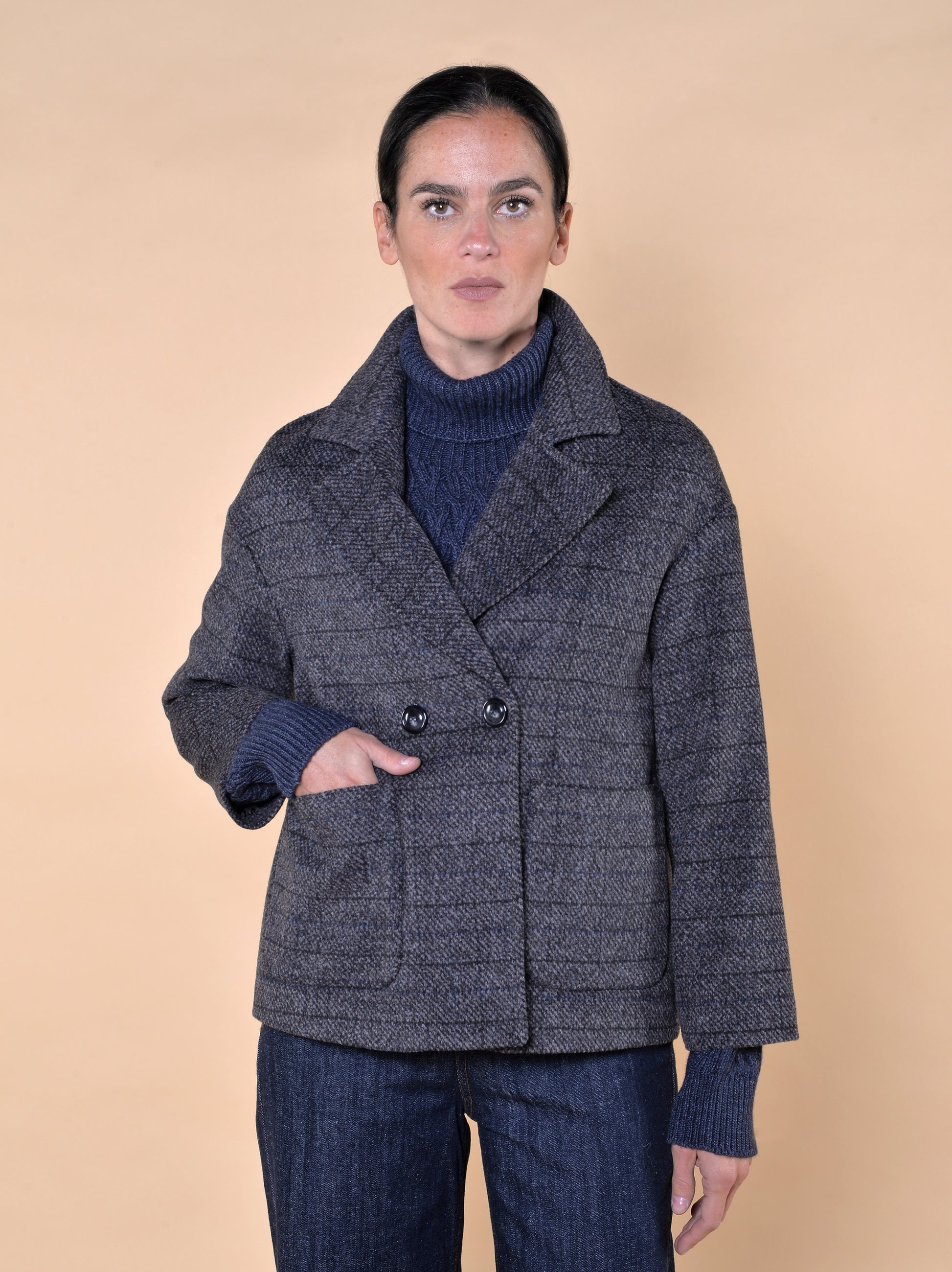 Cappa Doppiopetto Fantasia a Quadri con 2 Bottoni. Tasche a Toppa.