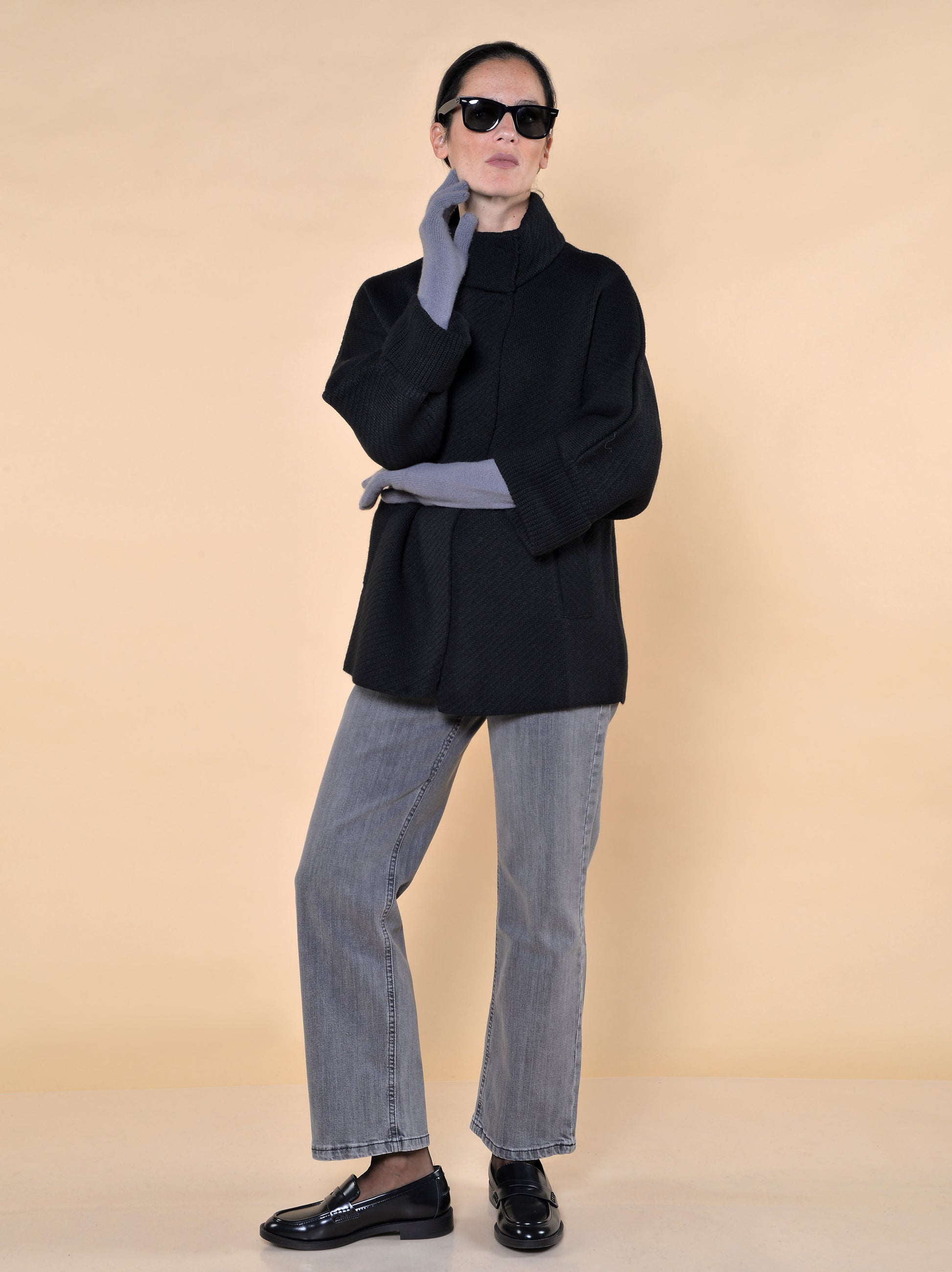 Cappa Svasata in Maglia. Chiusura con ciappe nascoste. Manica con Risvolto. Tasche.