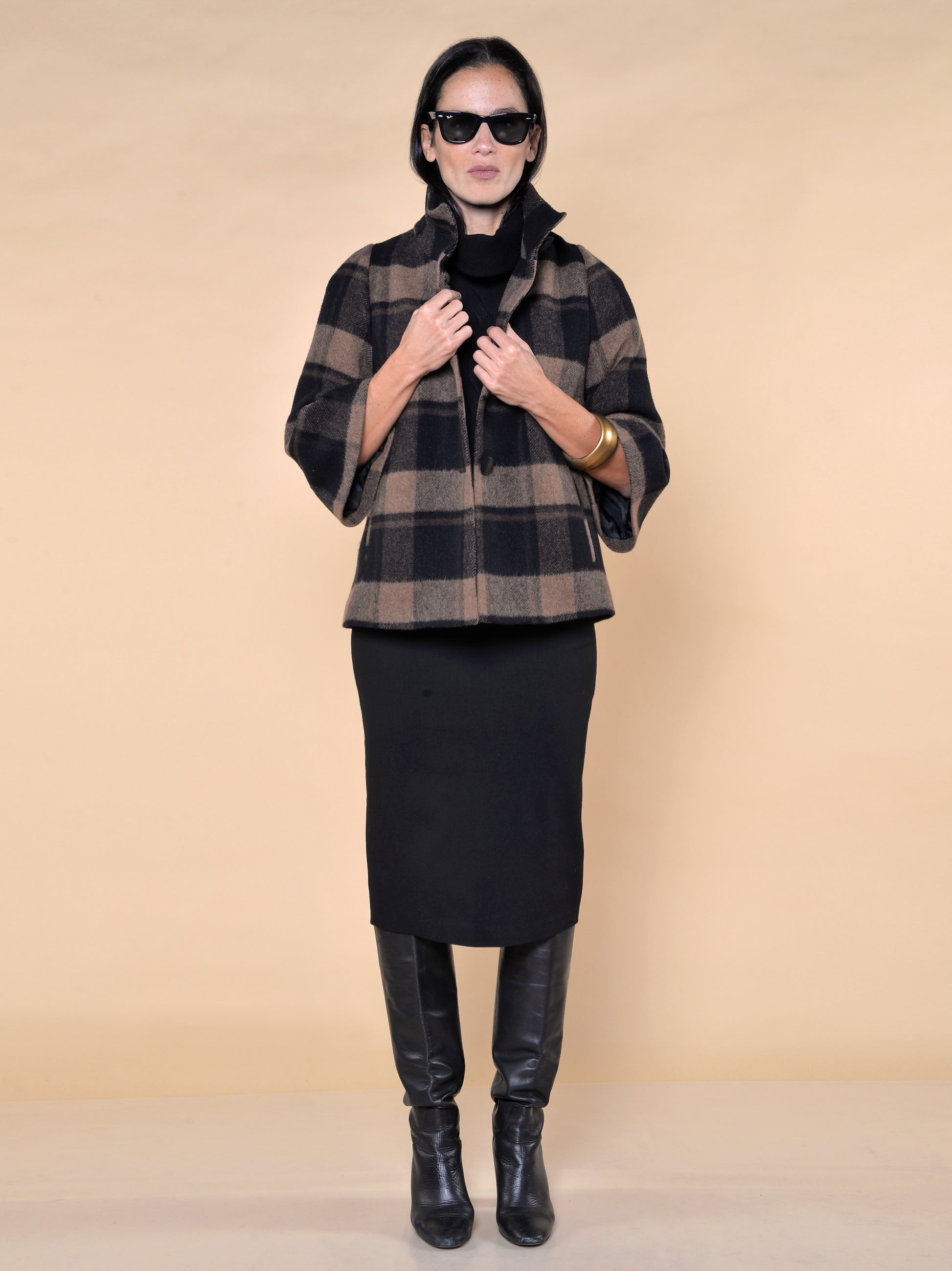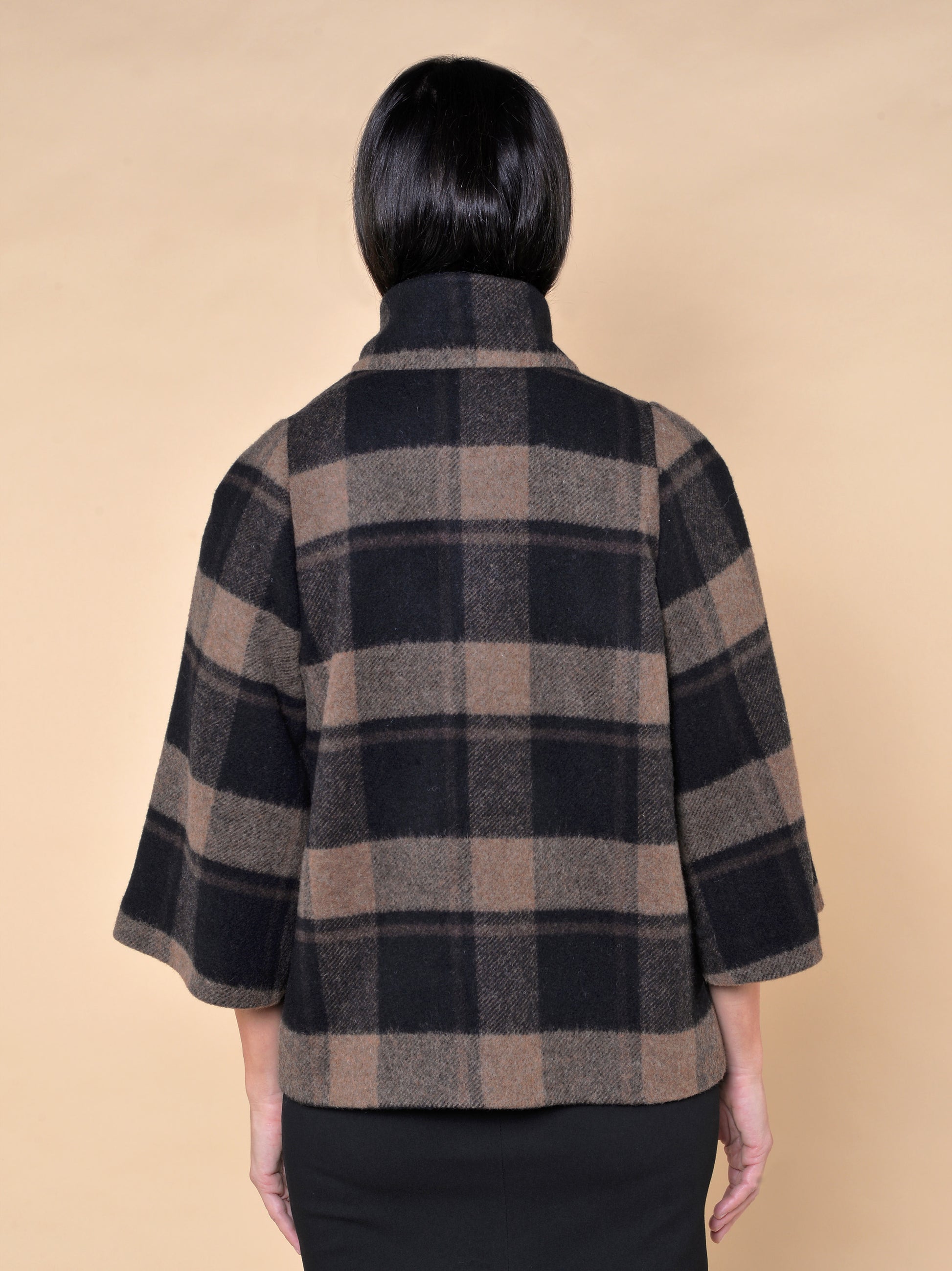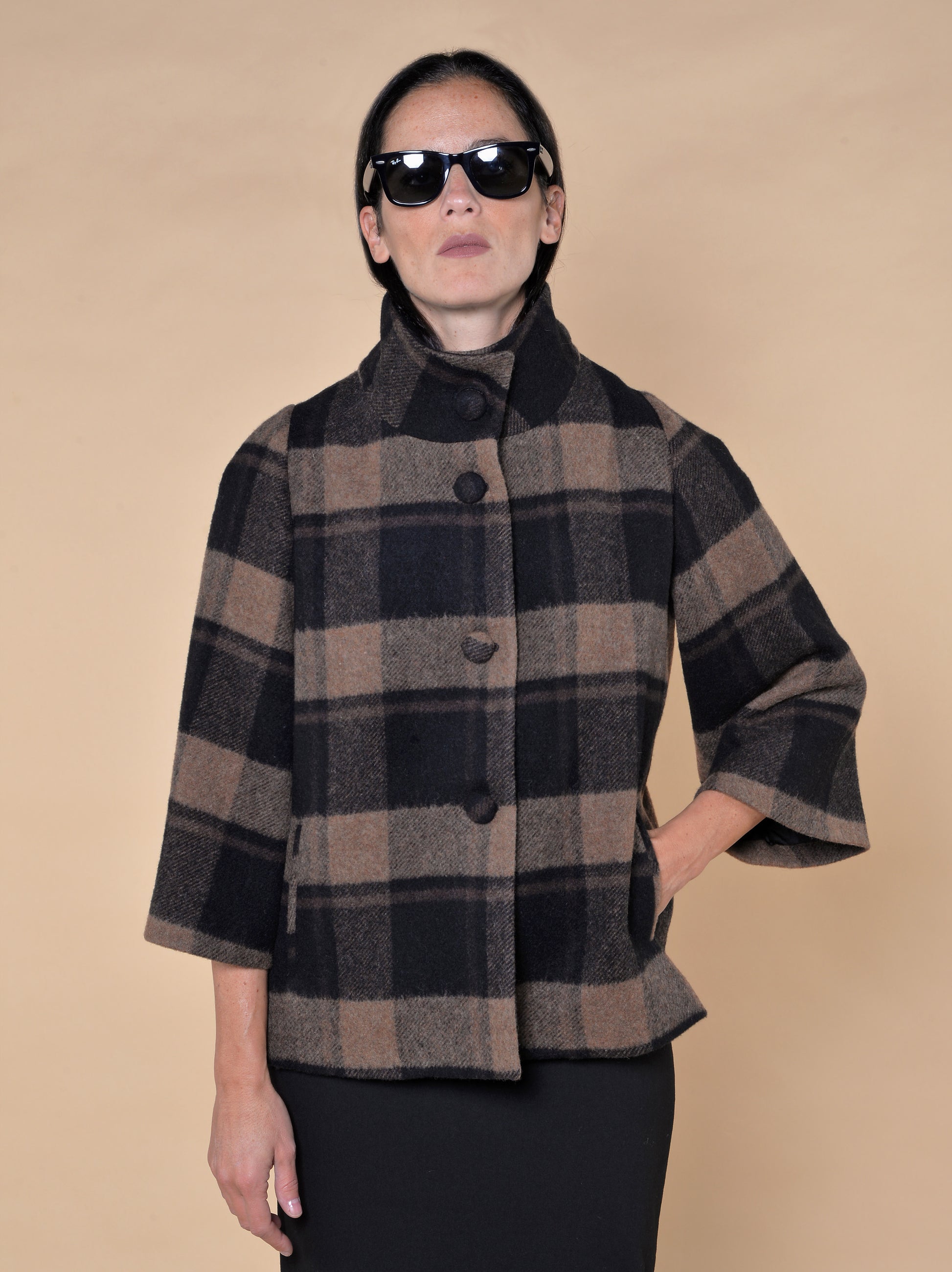 Giaccone Svasato Fantasia a Quadri. Manica 3/4 e tasche a filetto. Misto lana. Bottoni ricoperti nello stesso tessuto.