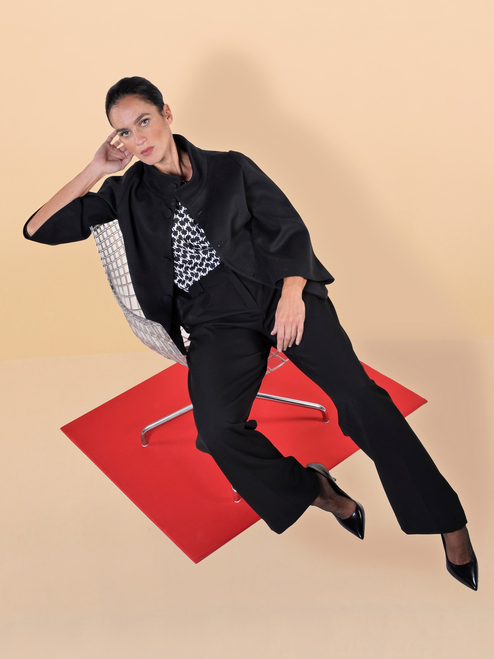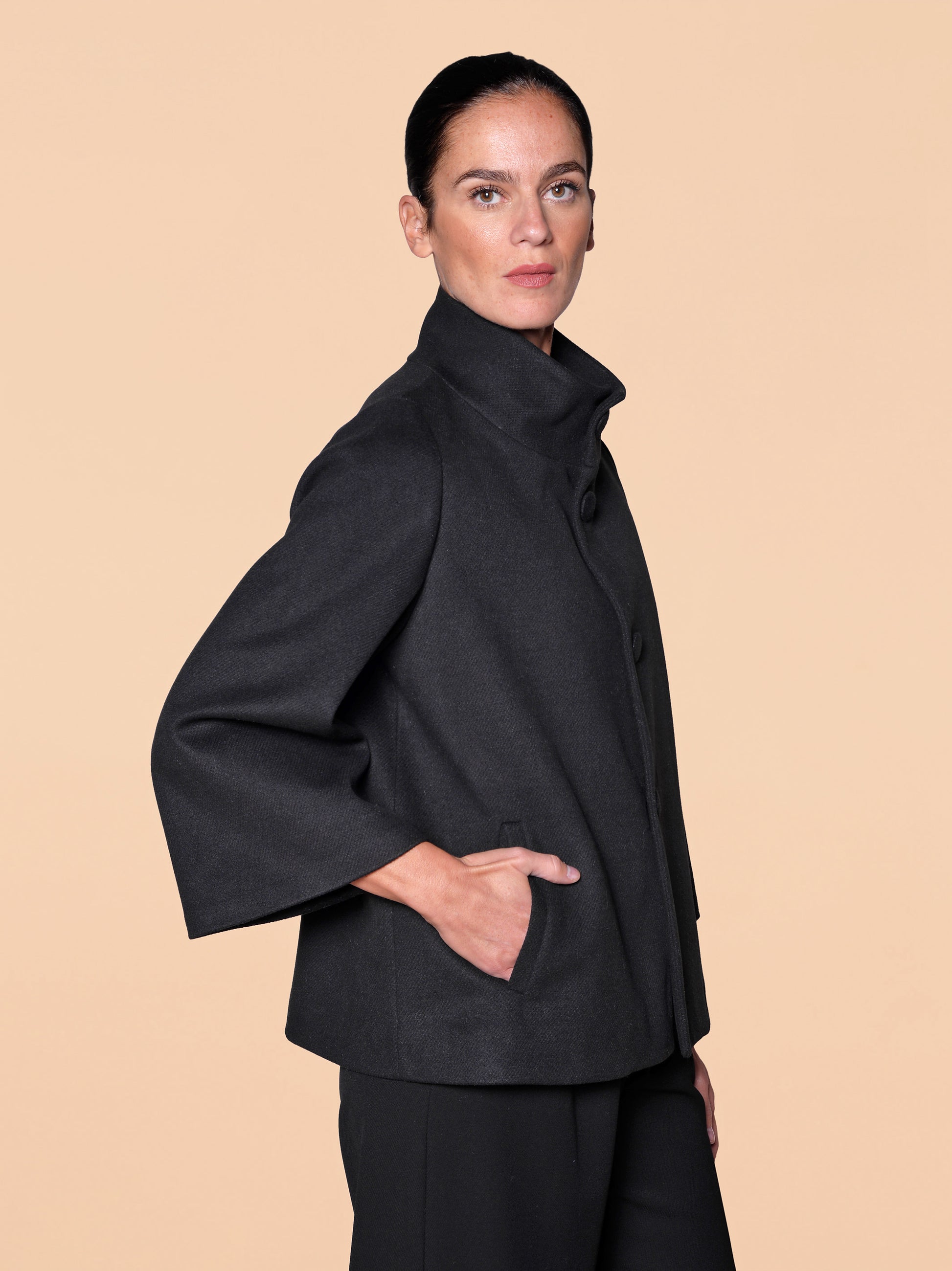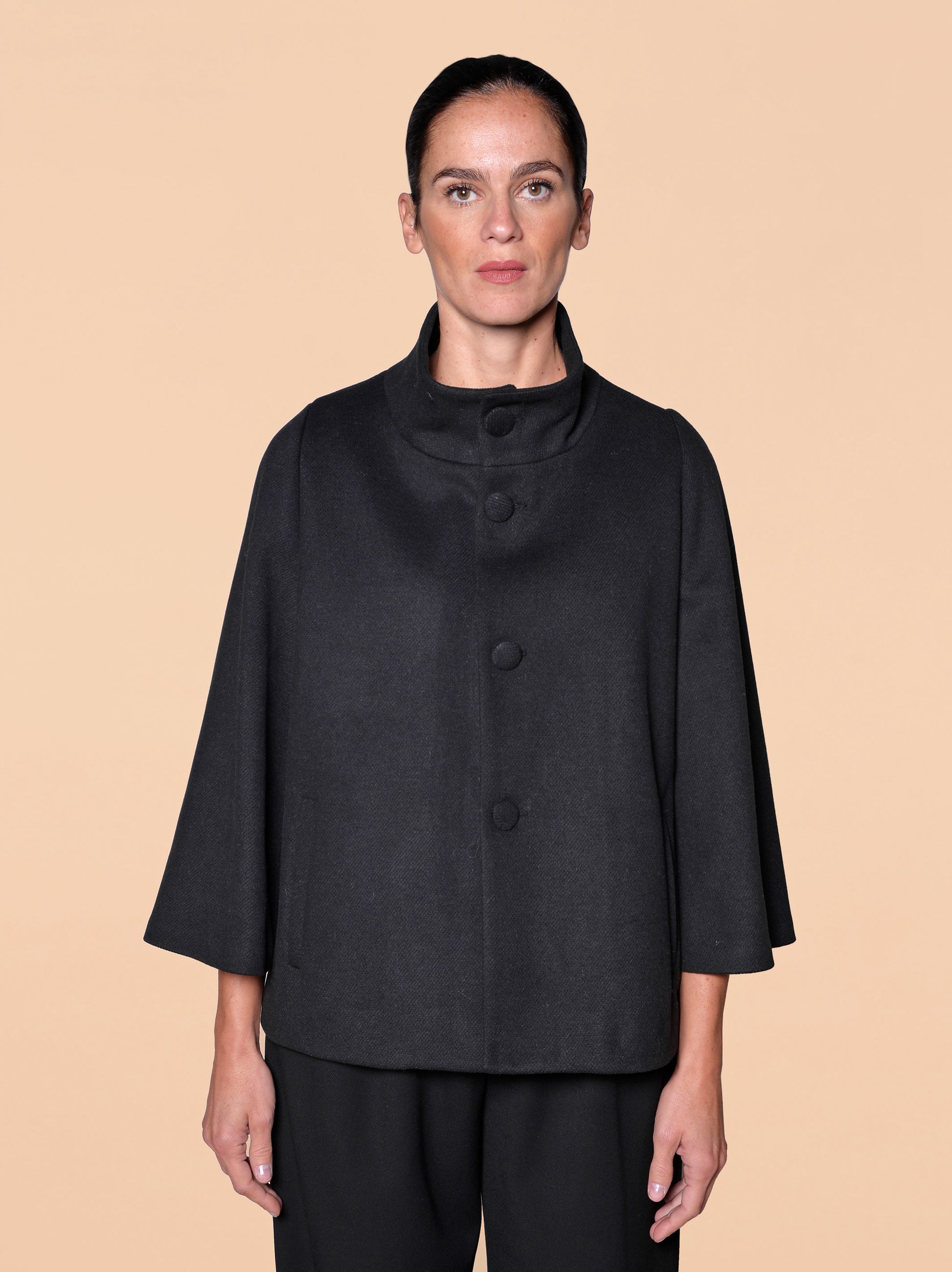 Giaccone Svasato. Abbottonatura a Uomo. Bottoni ricoperti nello stesso tessuto. Manica 3/4.