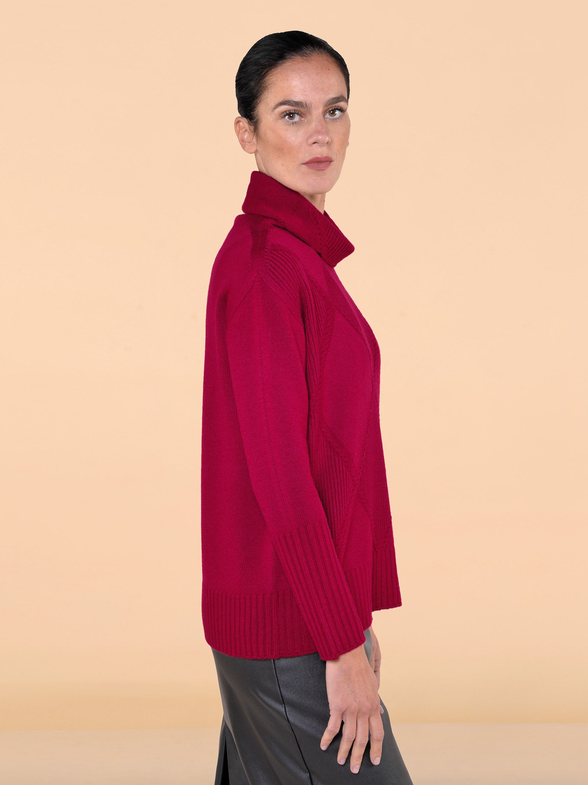 Maglia con Rombi e Trecce in Lana. Collo Alto. Manica Lunga
