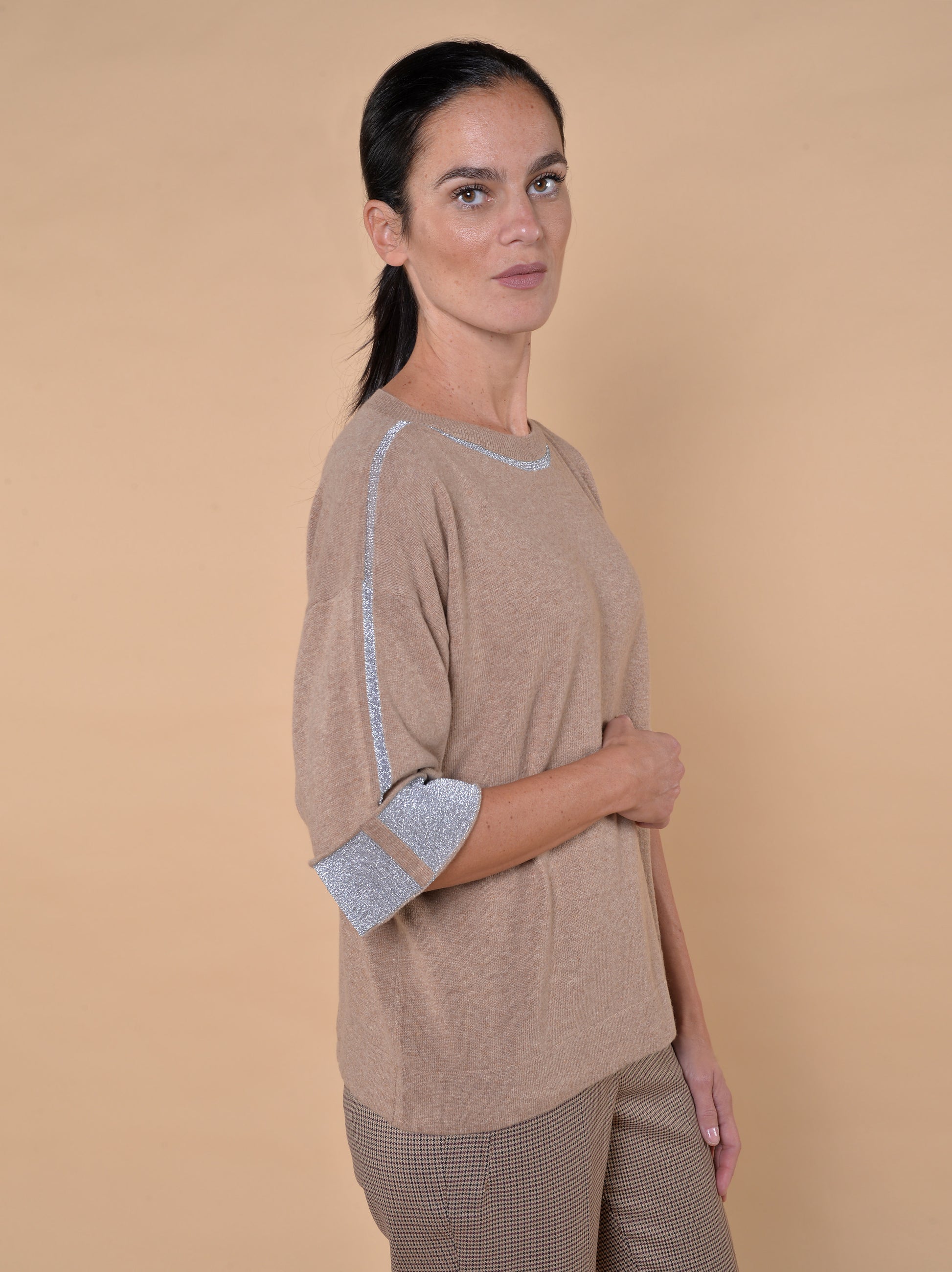 Maglia in Misto Lana. Manica 3/4. Risvolto e motivo lurex argento.