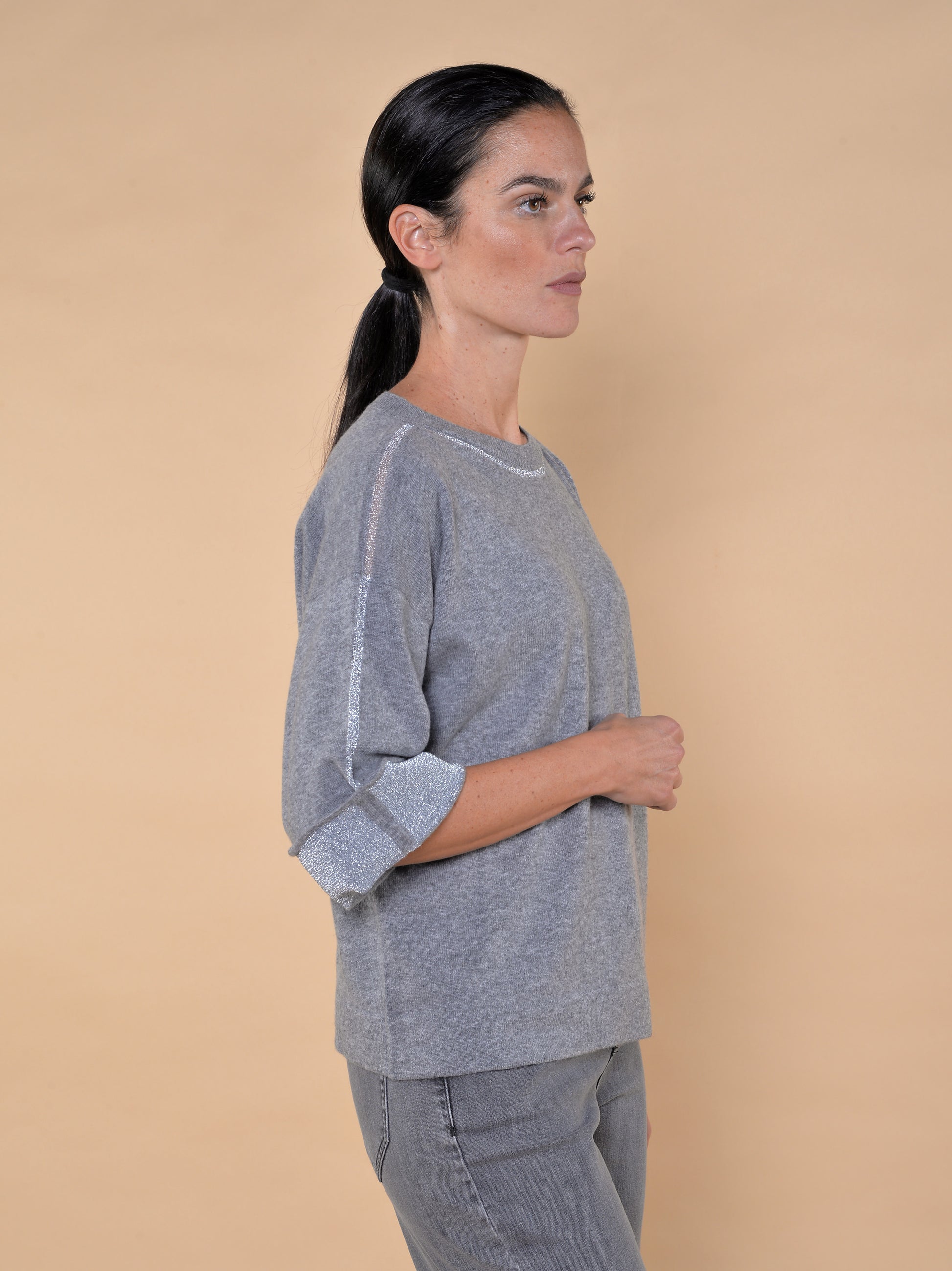 Maglia in Misto Lana. Manica 3/4. Risvolto e motivo lurex argento.