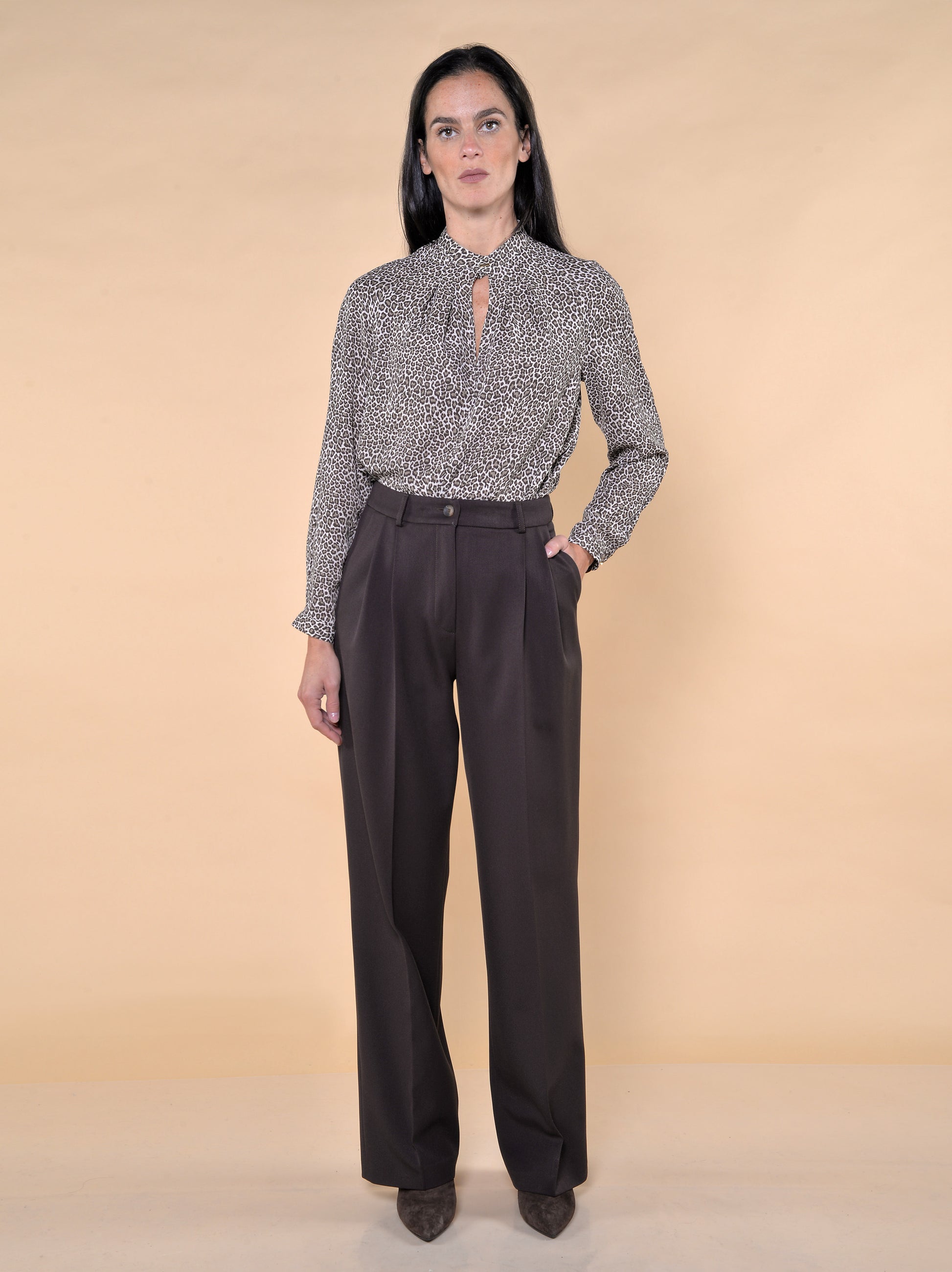 Pantaloni con Pences. Bustino con passanti. Tasche e abbottonatura avanti.