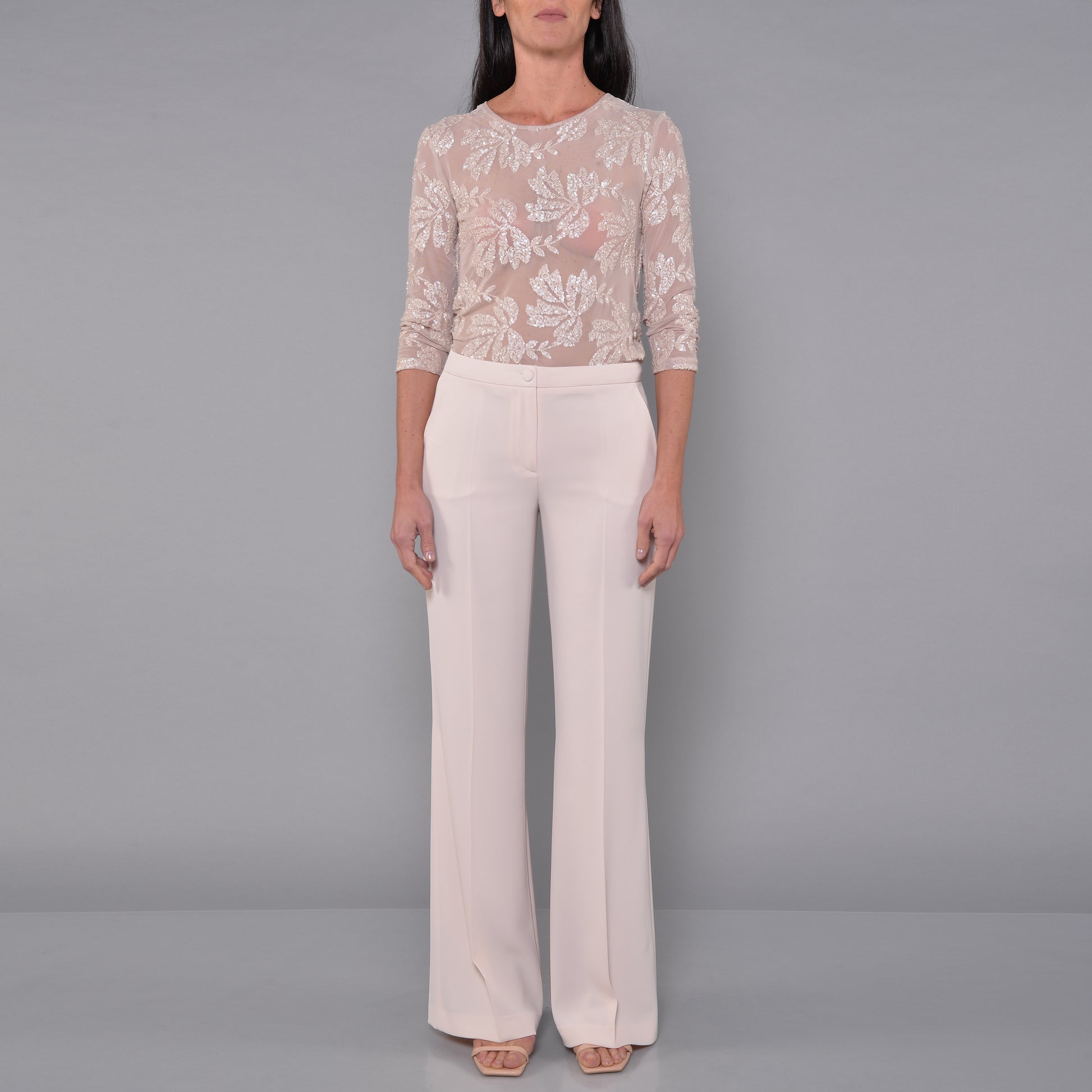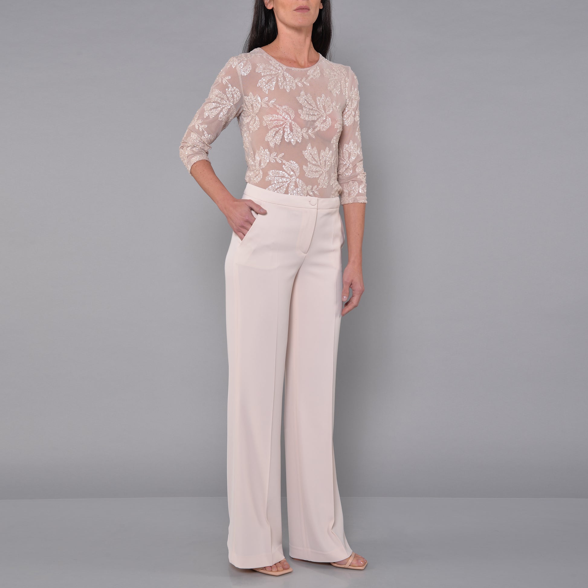 Pantaloni Gamba Larga. Abbottonatura sul davanti con zip e bottone ricoperto nello stesso tessuto. Tasche.