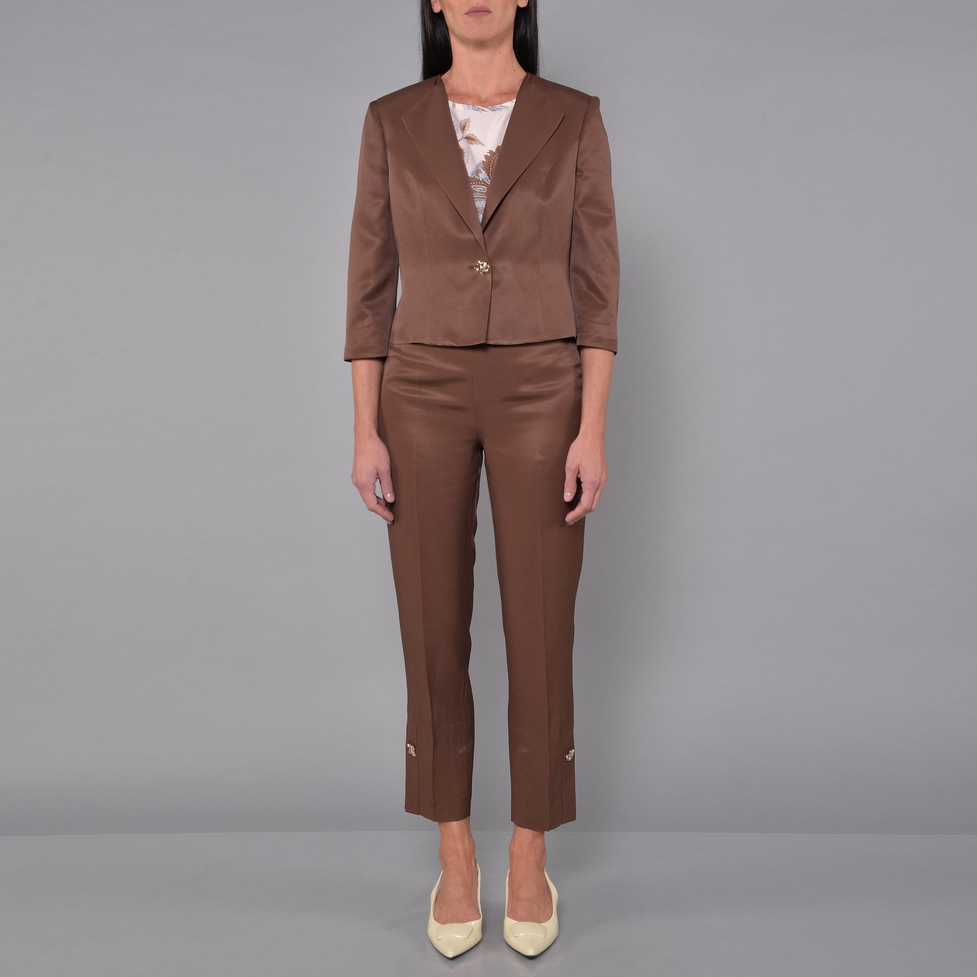 Pantaloni in Raso Lino Viscosa Cioccolato. Zip Laterale. Spacchi al Fondo Con Bottoni dalla Galvanica Oro.